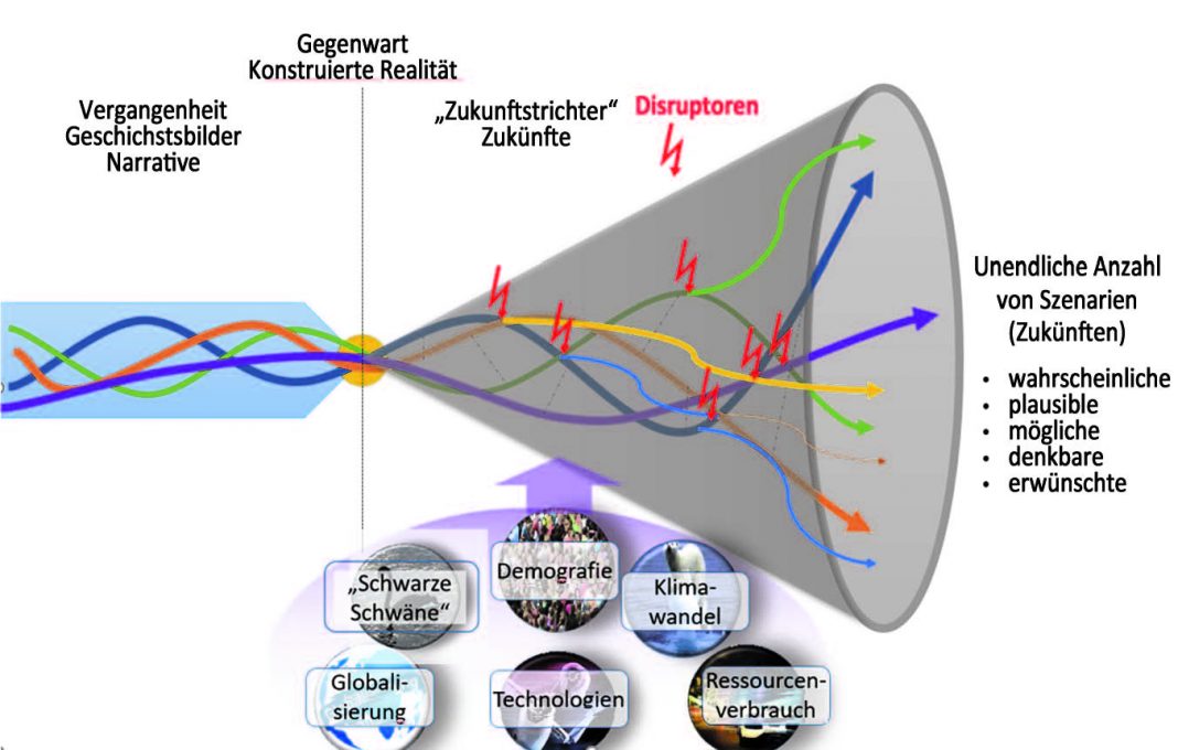Aus Geschichte und Gegenwart lässt sich vieles lernen, aber Zukunft auf der Grundlage von Zukünften des heutigen Standes der Wissenschaft lässt sich daraus weder ableiten noch vorhersagen. Zukunft ist auch nicht vorherbestimmt. Es gibt kein Gesetz des Fortschritts und gelingenden Wandels. Wer den Versuch unternimmt, aus der Geschichte zu extrapolieren und daraus auf die Zukunft zu schließen, verengt seinen Blick auf den Zukunftsraum und läuft Risiko, zu irren.
