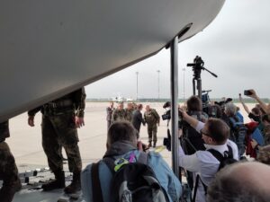 Bei der Pressekonferenz nach der Landung in Vilnius, bedankte sich der litauische Verteidigungsminister Kasčiūnas für die Stationierung der deutschen Brigade in Litauen und betonte, wie wichtig die militärische Präsenz in seinem Land sei, um Russland von einem Angriff abzuschrecken. Man wolle alles tun, damit sich die deutschen genauso wohlfühlen wie zuhause und das mit dem Beginn der Stationierung hoffentlich ein unumkehrbarer Prozess eingeleitet worden sei, so der Minister weiter. Mit Blick auf die Familien der deutschen Soldatinnen und Soldaten sagte Kasčiūnas, dass die derzeitigen Modellierungen vorsehen würden, dass ca. ein Drittel mit ihren Familien nach Litauen ziehen. Entsprechend werde man die notwendige zivile Infrastruktur, sei es Wohnraum, Schulen etc. ausbauen. Die Frage der Kostenübernahme ist allerdings noch nicht abschließend geklärt.